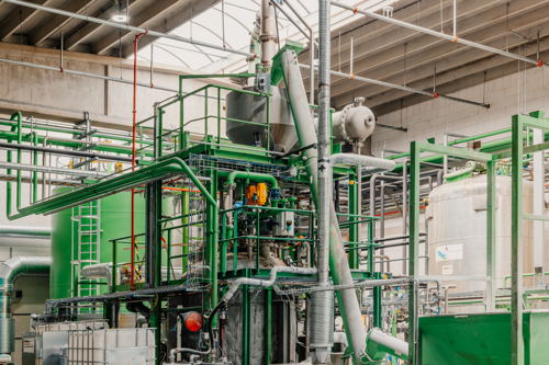 Le processus de recyclage comporte 3 étapes : le broyage, le filtrage et le recyclage chimique. Lors de la première étape, les plaques isolantes en PIR sont cassées avant d'être broyées en petits morceaux. La deuxième étape concerne un procédé développé en interne où un séparateur pneumatique, entre autres, permet de séparer les particules de PIR du revêtement en papier ou en aluminium des plaques. Le PIR purifié arrive ensuite dans un réacteur. Ce réacteur utilise la glycolyse pour séparer les composants du PIR, notamment le polyol. Le polyol recyclé peut ensuite à nouveau être intégré au processus de production standard. La réaction entre le polyol recyclé et le MDI permet de produire de nouvelles plaques isolantes en PIR. Grâce à ce nouvel investissement, Unilin est en mesure de couvrir jusqu'à 50 % de sa consommation de polyol avec du polyol produit en interne.